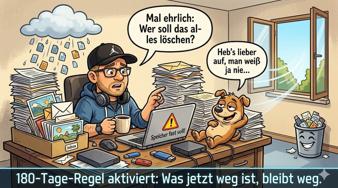 Das gibt mir die Freiheit, tatsächlich zu löschen. Ohne Panik. Ohne Angst. Mit dem Wissen: Wenn es wichtig war, hätte ich es in 180 Tagen gebraucht.