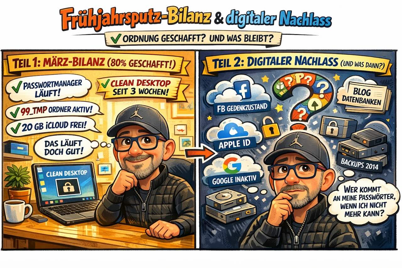 Teil 2 – Digitaler Nachlass: Was passiert mit Facebook, Google, Apple-ID, Passwortmanager, Blogs, MySQL-Datenbanken, wenn ich nicht mehr kann? Google Inaktivitätsmanager, Apple Nachlasskontakt, Facebook Gedenkzustand – kleine Funktionen, große Wirkung.