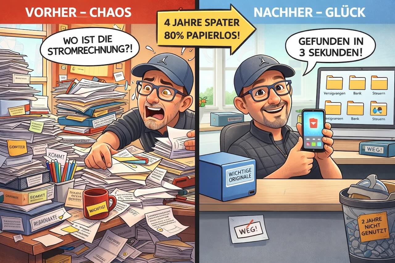 Der wichtigste Tipp: Einfach anfangen. Nicht das perfekte System aufbauen wollen. Einfach das nächste Dokument scannen. Den nächsten Brief digitalisieren. Und nach ein paar Monaten merkst du: Es geht.