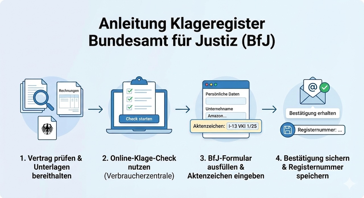 Seit Januar 2026 ist das Klageregister beim Bundesamt für Justiz (BfJ) für Anmeldungen offen [2]. Dies ist der entscheidende Moment für dich als Verbraucher. Nur wer im Register eingetragen ist, profitiert am Ende von einem positiven Urteil oder einem Vergleich.
